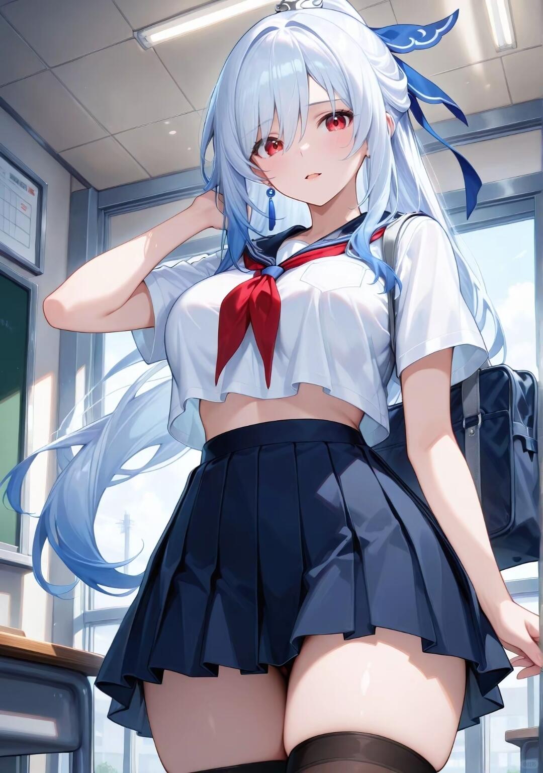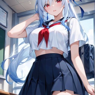 Karakter anime bergaya pelajar dengan rambut biru panjang dan seragam sekolah berdiri di dalam kelas. Nuansa slice of life yang hangat dan penuh detail membuat ilustrasi ini cocok untuk penggemar genre sekolah.